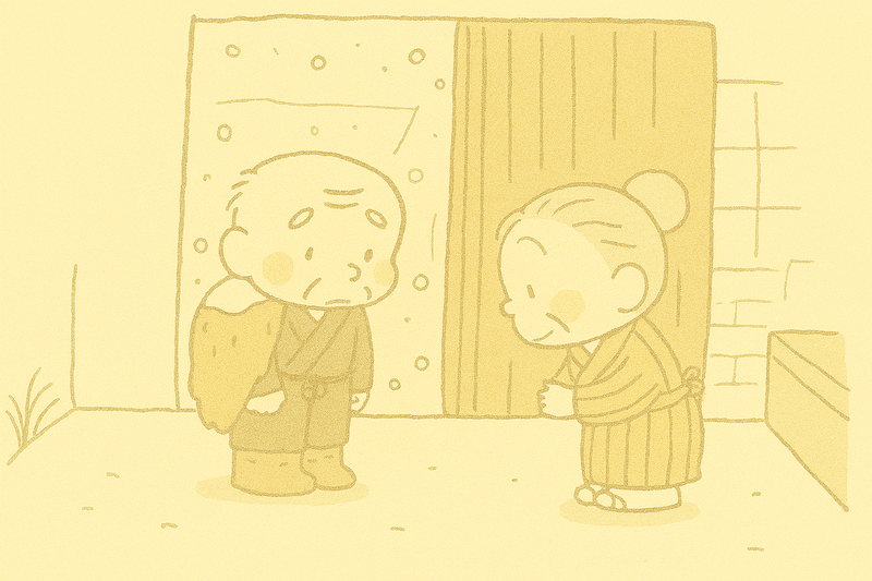 Trên đường đi, ông thấy sáu bức tượng Jizo sama đang đứng bên đường. Tuyết rơi đầy trên đầu và vai của các Jizo sama.